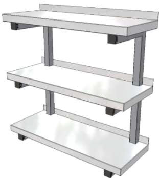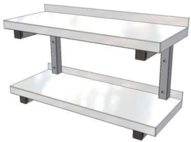 Celonerezové vyhotovenie. Police hrúbky 40 mm vystužené pozdĺžnymi výstuhami. Od dĺžky 1500 mm 3x konzola. Svetlosť medzi policami 300 mm. Nosnosť police 30 kg/na policu.